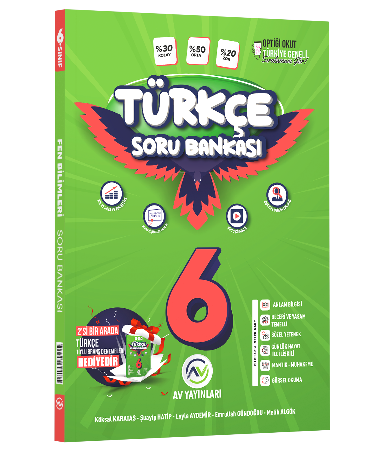6. sınıf öğrencileri için özel olarak hazırlanan AV Yayınları Türkçe Soru Bankası, %30 kolay, %50 orta ve %20 zor sorulardan oluşarak her seviyeye hitap eden bir içerik sunmaktadır. Optik okuma sistemi sayesinde Türkiye genelinde sıralamanızı görebilir ve seviyenizi ölçebilirsiniz. Kitap, anlam bilgisi, beceri temelli sorular, görsel okuma ve günlük hayat ile ilişkili konular gibi temel kazanımları içermekte ve video çözümleriyle desteklenmektedir. Ayrıca, 10’lu Branş Denemeleri HEDİYELİDİR!